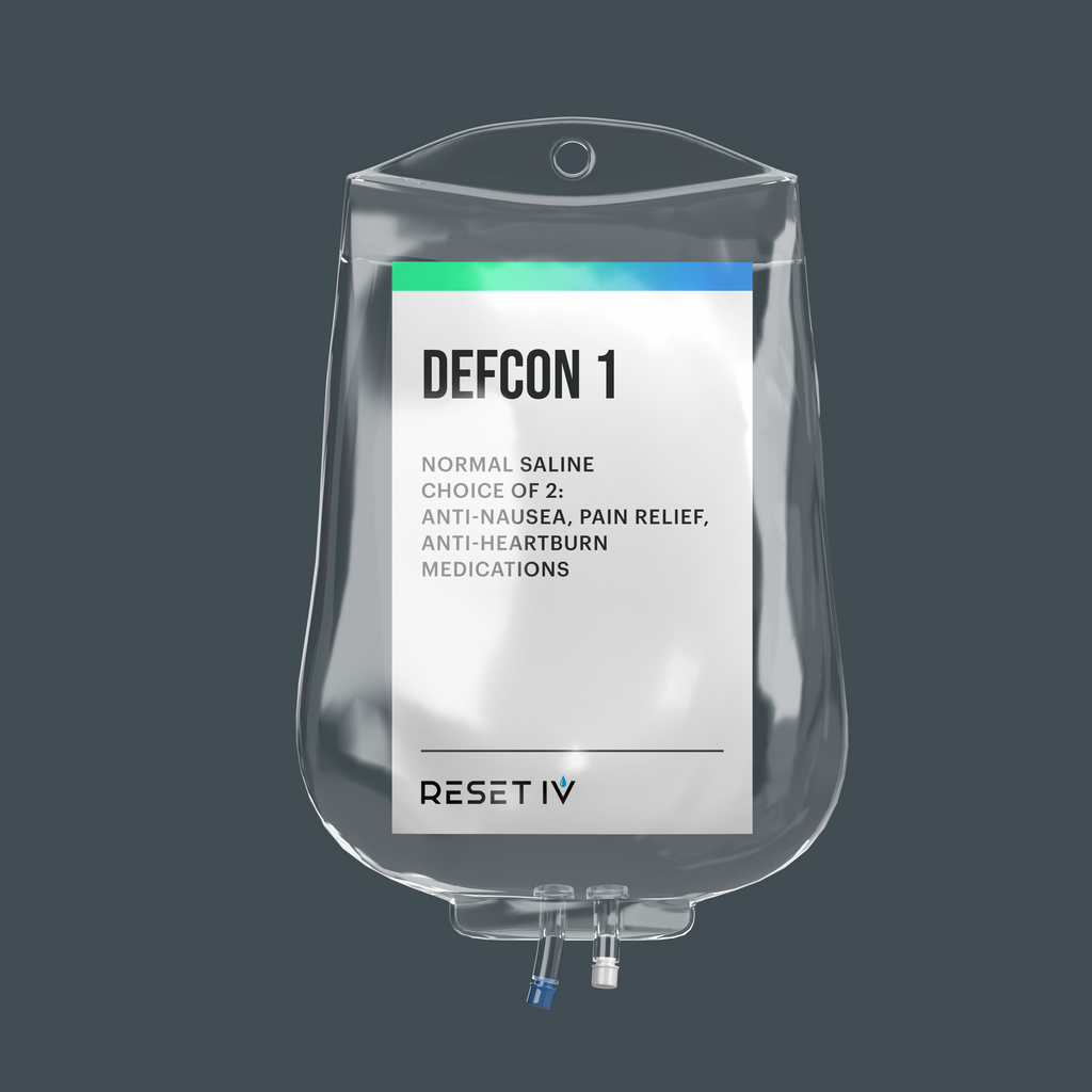 Whoa, there. If you didn’t know where your boundaries were before, you do now. There’s more than one thing keeping you down now. In addition to a full liter of fluid and electrolytes, DEFCON 1 gives you TWO medications to knock out the worst symptoms. Choose between Anti-Nausea, Anti-Heartburn, and pain relief meds.